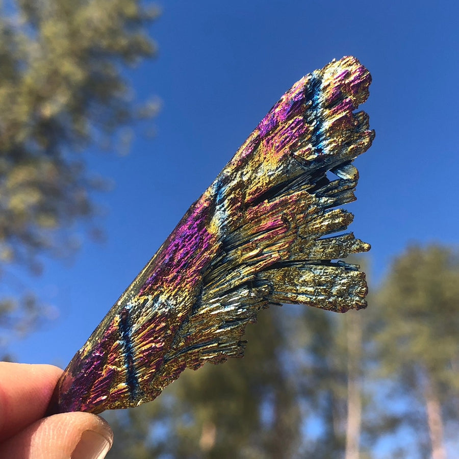WHAT IS RAINBOW PEACOCK KYANITE? Rainbow Peacock Kyanite, also known as Titanium Kyanite, is a captivating fusion of science and nature. This mesmerizing crystal features a coating of titanium over black kyanite, resulting in stunning rainbow colors that resemble fossilized fairy wings. Kyanite is a blue silicate mineral found in metamorphic pegmatites and sedimentary rock, used in various industrial applications. Titanium, a strong and lightweight element, takes its name from Greek mythology. It is present in living organisms, water, rocks, and soil.